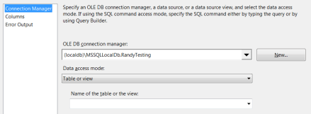 - Double click the OLE DB Source. The OLE DB Source Editor appears. It will automatically select the only OLE DB Connection Manager available, the one you made on step 2.