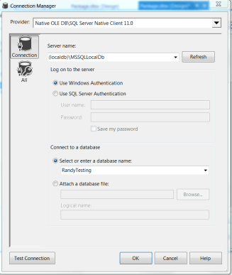- Create the Database Connection. There is a section below the “main stage” called “Connection Managers.” This is where you will create the link to the database for this package.
