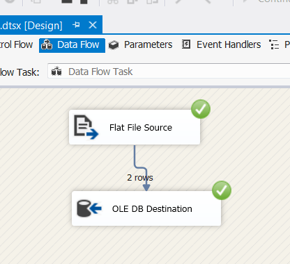 - Connect the two tasks by dragging the line from Flat File Source to the OLE DB Connection. The line actually contains information on the meta data, so now the OLE DB Destination knows what the fields and data types are going to be moving into the database.