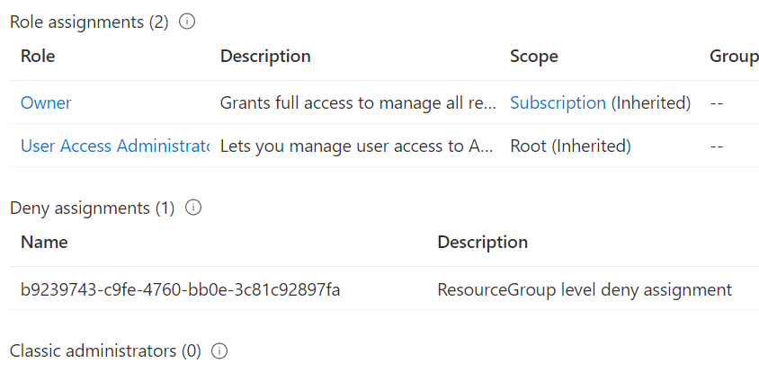 As the note says for “Deny assignments”: “Deny assignments take precedence over role assignments and also apply to classic administrator assignments.” Using myself as an example below, you can see that I am the Owner at the Subscription level, but that Deny below will block me.